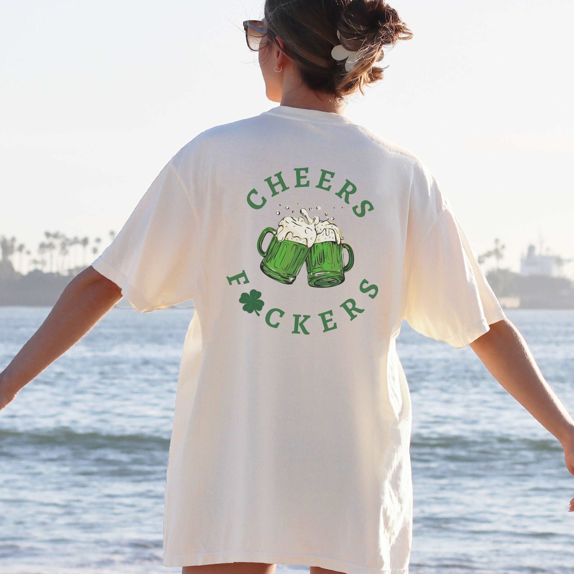 "Kick back and have a drink with Cheers F🍀ckers! Made with 100% cotton in bold colors, this shirt is printed on both the front and back for extra style points. Perfect for those who don't take themselves too seriously and love a good play on words. 🍻 (Limited time offer: Includes lucky charm 🍀) "